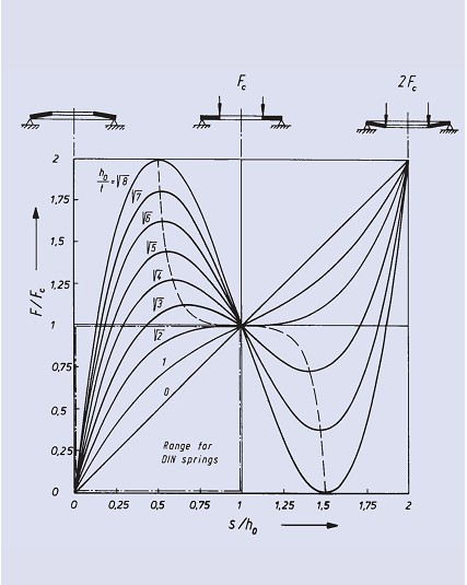 DIN2092標(biāo)準(zhǔn)詳細(xì)闡述了碟型彈簧變形行為的計(jì)算公式,該計(jì)算過程由ALMEN和LASZLO推導(dǎo)。盡管還有其它一些更為精確的分析等式,但該公式的準(zhǔn)確性足以滿足實(shí)際應(yīng)用的要求。
