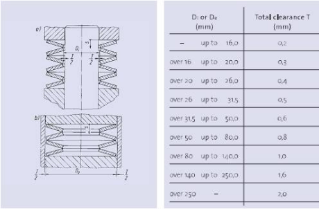 對于內(nèi)外兩種導(dǎo)向方式,彈簧與導(dǎo)向件之間都需要一定的間隙,T,以保證潤滑劑有充分的流動空間,從而確保導(dǎo)向正確。根據(jù)盤片內(nèi)徑Di(內(nèi)部導(dǎo)向)和盤片外徑De(外部導(dǎo)向)給出的對兩種導(dǎo)向方式總間隙T的規(guī)定。